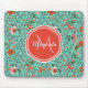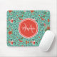 Ein Mousepad in Aquamarine mit hübsch orangefarbenem und pfirsichfarbenem Blumenmuster mit marinierten und grünen Blätter. Personalisieren Sie, indem Sie Ihren Namen und Monogramm in die Kirschtomate Rot abgerundeten Achteck-Abzeichen. Dies ist Teil der Aquamarine Floral Cherry Tomato Red Monogram Collection.