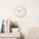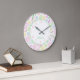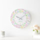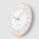 Blumenpastellmonogramm-runde Wand-Uhr für das Kinderzimmer des Babymädchens oder den Raum des Mädchens. Süßer Blumen-/Laub Wreath mit Rosen, Knospen, Beeren, Dahlien, Pastellfarben (Schatten von rosa, von korallenrotem, von Grünem, von Gelbem, von Blauem, Flieder). Grüne Grenze, korallenrote Zahlen und grüner individueller Name.