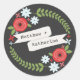 Ein Hochzeitsaufkleber mit einer Abbildung von roten und blauen Blumen und Grünpflanzen mit Banner in der Mitte. Personalisieren Sie sich mit den Namen der Braut und des Bräutigams. Der Hintergrund ist grau. Suchen Sie nach passenden Hochzeitseinladungen und mehr in Jill's Paperie.