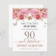 Girly Glitzer, Jahrtausende pink Hintergrund, mit extravagantem Skriptnamen Typografie. Happy 90 und fabelhafte Geburtstagsdesign Vorlage. Rosa Rosen und Schmetterling oberer Rand. Ideal für 90. Feiern. Save the Date feiern Erinnerung.