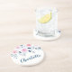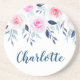 Elegante rosa Rosen und blaue Blätter Aquarellfarben mit individualisierbarem Text für einen Namen oder eine Monogramm auf einem Sandstein-Untersetzer.