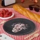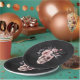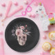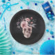 Ein sprichwörtlich schicker Halloween-Party mit einer Blumenschädel-Illustration mit rosa und lila Aquarellfarben-Blume auf einem rauchigen schwarzen Hintergrund.