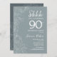 Einfache Marine & grau blaue Überraschung 90. Geburtstagsfeier Einladung. Minimalistisches modernes Design in schiefer, staubblauer Farbe mit botanischen Akzenten und Typografie-Script-Schriftart. Stahlblau-weiß-feminine Blütenkarte perfekt für eine stilvolle Frauen Überraschungsfeier. Kann für jedes Alter angepasst werden.