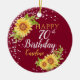 Ein glamouröser Geburtstagsschmuck. Dieses wunderschöne Ornament besticht durch die in Aquarellgelb gehaltenen rustikalen Sonnenblumen und die Stachelleuchten auf einem hübschen bordeauxfarbenen Hintergrund. Kann für jedes Alter und personalisiert durch Änderung des Namens angepasst werden. Ein ideales Geburtstagsgeschenk für Mutter, Mutter, Großmutter und viele andere