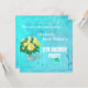 Blumenstrauß Mädchen zum Geburtstag Einladungen. Für Frühling und Sommer Zuhause und Garten Partys. Gelbe Blume, Vogel und Musiknoten im blauen Hintergrund.