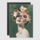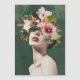 Ein faszinierendes digitales Kunstwerk einer Frau mit Blume und üppiger Vegetation, das ihr Gesicht schmückt, ihre Augen verschleiert und ein Gefühl von Geheimnis und Verbindung zur Natur schafft. Ihre sanften, stilisierten Merkmale kontrastieren mit den pulsierenden Blume und dem blühenden Laub, während der üppige grüne Hintergrund die Schönheit ihrer Blumenkrone unterstreicht. Die Komposition verbindet Surrealismus und Eleganz und verkörpert eine Harmonie zwischen menschlicher Form und Natur.