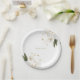 Diese wunderschöne Hochzeitspapiertafel bietet eine schöne Blumenbilderin mit goldenem Akzent, Pärchennamen und Text in der Farbe Goldtaupe, auf weißem Hintergrund.
