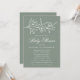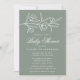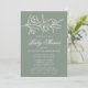 Elegante Blumendusche mit weißgestrichenen Blume und Blätter in der Nähe der Oberseite der Einladung mit einem schlauen grünen Hintergrund. Persönlich gestalten Sie die botanische Babydusche mit dem Namen der Mutter und den unten stehenden Duschdetails in klassisch weißer Schrift.