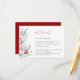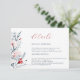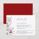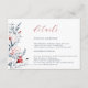 Die Blauer Blauer Blume Blauer Hochzeitstil-Detail-Abschlusskarte weist einen weißen Hintergrund mit einem lebendigen Blumendesign auf der links Seite auf und zeigt blaue Blumen mit roten Akzenten. Das Wort "DETAILS" steht ganz oben elegant geschrieben, gefolgt von Informationen über den Hochzeitsempfang, die Unterkünfte und eine Website für weitere Details. Diese Karte ist so konzipiert, dass sie den Gästen wichtige Informationen in einem optisch ansprechenden Format vermittelt, sodass sie eine stilvolle und praktische Ergänzung zu jeder Hochzeitssuite ist.