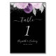 Die Hochzeitsnacht der eleganten, modernen Tischnummer mit Blumenstrauß in lila und Lavendeltönen, bestickt mit Silberfolie aus Imitat und Imitaten Glitzer und mit silberfarbenem Imitat Glitzer bespritzen. Das Wort "Tabelle" erscheint in silbergrau whimsical Handschrift Skript auf einem schwarzen Hintergrund, mit der Zahl unten, zusammen mit den Namen des Paares und dem Hochzeitstag.