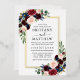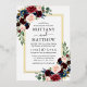 Moderne Elegant Watercolor Burgund Blue Floral Wedding Einladung umfasst burgundische Rose, rosa Rosen, blaue Blumen, rote Blume, Eukalyptus-Blätter und botanische Vegetation. Zwei Rahmen - Doppelrahmen - Goldfolie