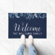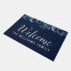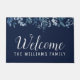 Willkommene Typografie mit Familiennamen und blauem Blattwerk in Aquarell. Sie können Farben und Text auf dieser Matte bearbeiten