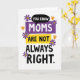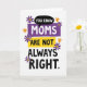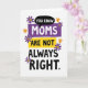Entworfen mit einem hohen, grafischen Layout, stapelt diese Karte eine freche Botschaft in großen, leicht lesbaren Buchstaben. „YOU KNOW“ sitzt nahe der Oberkante in einer schwarzen Sprechblase, wie ein ruhiger Seitenhieb, der zwischen Freunden geteilt wird ❤️. Direkt darunter erscheint „MOMS“ in weißen Buchstaben, zentriert auf einem violetten Rechteck, was ihm einen starken visuellen Fokus gibt, ohne hart zu wirken. „ARE NOT“ ist als nächstes auf einem hellgelben Rechteck platziert und fügt einen sonnigen Kontrast hinzu, der den Ton leicht und neckend hält. Die Zeile „ALWAYS RIGHT.“ landet am unteren Ende in schlichter schwarzer Schrift auf weißem Hintergrund und liefert den Witz mit einem trockenen, sachlichen Abschluss. Um die Wörter herum mildern kleine Blumenformen in tiefem Violett mit gelben Zentren und einigen orangefarbenen Blüten die Geometrie und fügen eine sanfte, für