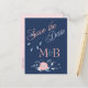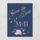 Blush and Blue wedding Save The Date Postkarten, mit boho Blumenmotiven und personalisierten Monogrammen, Namen, Datum und Texte. Die Rückseite ist rot.