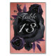 Eine satinrote Tischnummer mit dunkelblauen Rose und lila Blattwerk verleiht den Gästen den Empfang-Sitzplan. Diese elegante Tischnummer besticht durch gotische Elemente, die mit moderner Ästhetik verwoben sind. Es verbindet sich elegant mit schwarzen Hochzeiten, gotischen Hochzeiten oder modernen Hochzeiten im Herbst. Dunkle Rose blühen inmitten dunkler Blumenmotive und verströmen einen geheimnisvollen Reiz, der über die Jahrhunderte hinweg hallt.