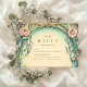Das Design ist eine bezaubernde Mischung aus Vintager und botanischer Eleganz und besticht durch sanfte, blütengrüne Rose, die mit saftigen grünen Blätter und zarten blauen Farbtönen verziert sind. Gerahmt in verzierten Gold- und Elfenbeinkurven, erinnert die Einladung an eine märchenhafte Gartenatmosphäre mit einer klassischen Jugendstil-Drehung, die sich perfekt für eine romantische und zeitlose Hochzeitsfeier eignet.