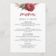 Romantische Hochzeitskarte mit blauen Rose und Pampas-Gras im sanften Boho-Stil. Ein idealer Begleiter für Ihre Hochzeitsfeier, für rustikale Gartenzeremonien, Empfang im Freien oder für elegante böhmische Veranstaltungen. Enthält vollständig bearbeitbare Abschnitte für Vorspeisen, Salat, Hauptgericht und Nachtisch. Koordiniert wunderschön mit den passenden Einladungen für Hochzeiten, RSVP-Karten und Beschilderung im gleichen Blumendesign.