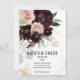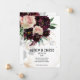 Ein modernes und elegantes blütenrosa und bordeauxfarbenes Blumenbouquet mit einem sanften Schatten, der sich auf die Einladung und glitzernde Goldspritzen und -elemente ausbreitet, mit Ihren Vornamen in einem modernen Schriftart mit einem numerischen Hochzeitstermin darunter und einem kleinen Schriftart für die Details. Diese luxuriöse, rot-gelbe Einladung ist für jeden Anlass geeignet.