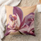 Hochauflösendes nah-up eines rosa Cymbidium Orchideen mit gestreiften Blütenblättern und einer rot gesprenkelten Lippe, Set gegen einen weichen pfirsichfarbenen Hintergrund. Elegante botanische Fotografie für Drucke, Karten, Textilien und moderne Wohngestaltung.
