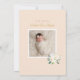 Diese stilvolle Tauffeier und die Lunch-Einladung für ein kleines Mädchen zeichnen sich durch eine elegante, maßgeschneiderte Formulierung für Ihre besondere Veranstaltung aus, die durch ein goldenes Kreuz und ein wunderschönes, blumenfarbenes Aquarellbild mit bemalten Rose, ranunculus Blume und Grün in neutralen Farbtönen wie Weiß, Creme, Gold, Rose und Grün geprägt ist. Auf der Kartenrückseite erscheint ein pastellfarbener Pfirsichhintergrund mit Platz für das neugeborene Foto. Personalisieren Sie den Text "Gott segne" mit dem Namen des Babys im Skript.