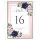 Elegante marineblaue und blühende Tischnummern für Hochzeiten. Matching-Elemente verfügbar.