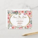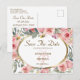 Blumenfarbenhochzeit Save the Date Postcard besticht durch schöne, weiche, rosa Blume mit Grün und einen eleganten Rahmen aus Gold._