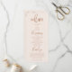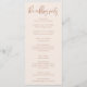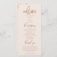 Modernes, minimalistisches Hochzeitsprogramm mit boho script Schriftart. Rosa Hintergrundfarbe mit Terrakotta-Farbtexten. Alle Informationen über die Hochzeitsfeier und den Namen der Hochzeitsfeier auf diesem Programm aufgeführt.