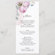 Dieses Hochzeitsmenü ist in einem sanften, pastellfarbenen Aquarell-Rosa-Hintergrund mit Blumenbildern im Aquarellstil gehalten. Auf der links Seite kaskadieren zarte, rosafarbene Pfannkuchen und üppige grüne Blätter, die eine romantische und Bio Touch verleihen. Das Layout ist sauber und ausgewogen, mit eleganter Typografie in einer Mischung aus fließenden kursiven und klassischen Serifen-Schriftart, die Eleganz und Wärme vermitteln. Das Gesamtdesign fühlt sich zeitlos und einladend an, perfekt für eine Gartenfeier oder Weinkellerei.