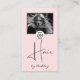 Blush Pink Photo Script Hair Logo QR Code Social Business Card. A sophisticated business card design with photo upload, logo, QR code and social icons. Clean and classic, chic black script on blush pink background, this card perfectly represents a stylist specializing in timeless beauty. Add all your details and your best photo to represent your brand. Upload your logo. Add your website URL in the QR code text box, ungroup the social icons in the design edit tool to make changes. Contact the designer for any customization questions.