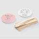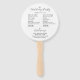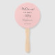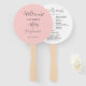 Hochzeitstag-Programm gedruckt auf einem runden Handlüfter, der auf der Vorderseite einen trendigen, rosa Farbhintergrund mit Brautnamen und Bräutigam in dunkelgrauem, stilisiertem Skript aufweist. Auf der Rückseite des Programms sind die Teilnehmer der Hochzeitsfeier und die Zeremonie-Rites auf weißem Hintergrund mit dunkelgrauer Schrift aufgeführt. Bearbeiten Sie den Handventilator und ersetzen Sie die Informationen zum Hochzeitsprogramm durch Ihre eigenen. Ideal für eine Hochzeitsfeier im Innen- oder Außenbereich! Wählen Sie die gewünschte Anzahl von Hand-Lüfterprogrammen aus.