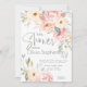 Rustikale und elegante Babydusche mit kaskadierendem Blumenstrauß aus sanften pastellfarbenen Rose, Peonies und Blättern in den Farbtönen Rosa, Blasspfirsich und Elfenbein, sanft grüne botanische Blätter und Eukalyptusgrün mit einem Hauch goldgefleckter Blätter und handgeschriebener Kalligrafie. Benutzen Sie unsere leicht anpassbare Vorlage, um Ihre Babydusche-Details zu personalisieren - die Rückseite ist ein reichhaltiges gedämpftes Grün mit einem wunderschönen Strauß passender Blume . ©Whimsical Artwork™