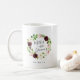 Die Tasse ist ein Geschenk für die Mutter des Bräutigams, mit einem blütenrosa und bordeauxfarbenen Blumenkranz in Aquarellfarbe, in dem in handgeschriebenen Schriftzeichen die "Mutter des Bräutigams" eingetragen ist. Personalisieren Sie sich mit Ihrem Hochzeitsdatum unten. Entworfen, um unsere Blush Romance Kollektion zu ergänzen.