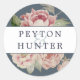 Chic florale Hochzeitsaufkleber sind der perfekte Weg, um Ihre Einladungen, Favoriten und vieles mehr zu beenden. Rundaufkleber, die auf unsere Blush-Rose abgestimmt sind, sind mit einem Strauß von Aquarell-Rose und Blume aus Peony in bestickten Rosa- und Salbei-Grün-Tönen auf gebürstetem Blau gestaltet.