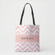 Tragen Sie Ihre Sachen stilvoll mit dieser schicken, modernen Tasche. Das Design zeichnet sich durch eine hübsche, rosa, Zickzack Zickzack-Rose und einen Streifen aus, sowie durch Ihren Namen oder andere angepasste Texte in einem einfachen schwarzen typografischen Schriftart aus. Text kann auf der Vorder- und Rückseite der Tasche unterschiedlich sein. Dieses elegante und trendige Accessoire ist ein stilvolles Geschenk für sie. Perfekt als Brautparty oder Junggeselinnen-Abschied Gunst oder als Brautjungfrau oder Lehrerin Geschenkidee.