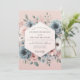 This elegant design features a romantic arrangement of painterly florals. Lush slate blue dahlias and soft blush pink roses are nestled among delicate greenery and white accent blossoms. The soft, dreamy aesthetic is set against a warm, dusty rose background, creating a sophisticated and timeless feel for your union.
