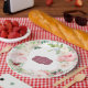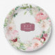 Die blauen, bordeauxroten und grünen Blumen umgeben ein tiefmauves Abzeichen mit Initialen und dem Hochzeitstag eines glücklichen Paares. Das Ambiente im englischen Garten ist hübsch und vollkommen feminin.