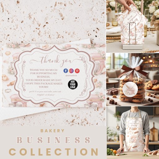 Delicate blush tones, vintage baking illustrations, and soft floral accents create a romantic patisserie-inspired aesthetic. Featuring elegant mixers, rolling pins, and pastry details layered over a warm neutral backdrop, this design captures the charm of a boutique bakery with a refined feminine touch.