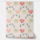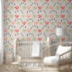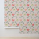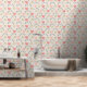 Große, rot-rosa Blume in vertikalen Reihen auf einem weichen pastellrosa Hintergrund.