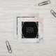 Die eleganten und stilvollen Visitenkarten sind mit einem abstrakten Hintergrund aus rosa und grauem Marmor gestaltet und mit einem geometrischen, weißen Overlay umrahmt von einem schwarzen Quadrat.