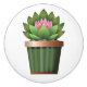 Aeoniumsukkulent mit rosa Blume in einem grün gestreiften Topf.