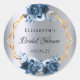 Ein trendiger Bohemischer Boho Sticker für ein Brautparty. Die Rose sind in Marineblau und in Blau gehalten. Elegante Imitate silbermetallisch aussehender Hintergrund. Ein Imitat goldener geometrischer Rahmen. Vorlagen für den Namen und das Datum der Braut. Mit dem Text: Brautparty geschrieben mit einem handgeschriebenen Stil Skript. Schwarze Buchstaben. Ideal für Taschen mit Vorzug oder als Save the Date Erinnerung für die Gäste! Ideal für eine Winterdusche.