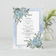 Dusty blauen Aquarellfarben Blume und Blätter blumengeschmückte Winterhochzeit Einladung. Dieses elegante Design zeigt einen silbernen Rahmen und staubblaue Aquarellfarben-Blume mit sukkulenten und eukalyptusfarbenen Blätter an den oberen und unteren rechten Ecken und Ihrem Text in Grau und Schwarz. Hinter dem Rahmen befindet sich ein blauer Splash-Hintergrund.
