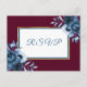 Eine elegante RSVP-Karte für eine Hochzeit mit Vorlagen für die Antwort nach Datum, Namen etc. Ein goldfarbenes Imitat, klassisch blau und weiß mit Blume in Aquarelltönen, Rose in Blau. Burgunder Hintergrund, blauer Text. Zurück: klassisch blauer Hintergrund, weiße Buchstaben.