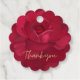 Brautparty-Favorit-Tags in Blütenmuster mit Rose in Rot- und Maronfarbe mit blumenvergoldetem und botanischem Muster.Ein perfekter goldfarbener und weißer Hintergrund mit roter Blütenanordnung