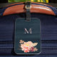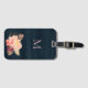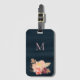 Navy blaue Textilien wie Hintergrund mit blauen Aquarellbäumen und Rose auf goldenem Blattwerk. Benutzerdefinierte rot rosa elegante handgeschriebene Monogramm zur Anpassung Ihres Gepäckanhängers