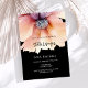 Eine moderne, stilvolle und glamouröse Einladung für eine 50. Geburtstagsfeier (oder jedes Alter). Schwarzer Hintergrund, mit einem großen Pfirsich und lila, wasserfarbener Blume dekoriert. Der Name wird mit einem handgeschriebenen Stil-Skript geschrieben. Personalisieren Sie Ihre Party-Daten und fügen Sie sie hinzu.