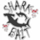 Surf-artige Hai Köder Aufkleber mit einer schwarzen Silhouette eines Hammerkopfhais schwimmen im Ozean, kreisend auf der Suche nach Nahrung, mit roten Spritzen von Blut im Wasser.