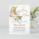Personalisieren Sie diese skurrile Einladung einfach und schnell mit Ihrer eigenen Formulierung, drücken Sie einfach den Knopf Anpassen, um Stil und Anordnung des Textes weiter zu gestalten und zu formatieren. Mit einem süßen Babyelefanten, der auf einem blüten, grün und blumengeschmückten Halbmond sitzt, mit einer Überschrift "Wir sind über dem Mond". Platz für Geschenkregisterdetails auf der Rückseite der Einladung. Matching Items im Store! (c) The Happy Cat Studio