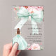 Der helle, durchsichtige Hintergrund ist mit einem großen, grün gefärbten Bogen, rosa Blume und einem Mädchen in einem grünen Kleid verziert. Personalisieren und fügen Sie einen Namen und Party-Details hinzu.