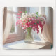 Ein klares Mason-Glas mit einem blühenden Bouquet aus rosa und weiß blutenden Blume, das durch ein Fenster hindurch von sanftem Sonnenlicht erhellt wird